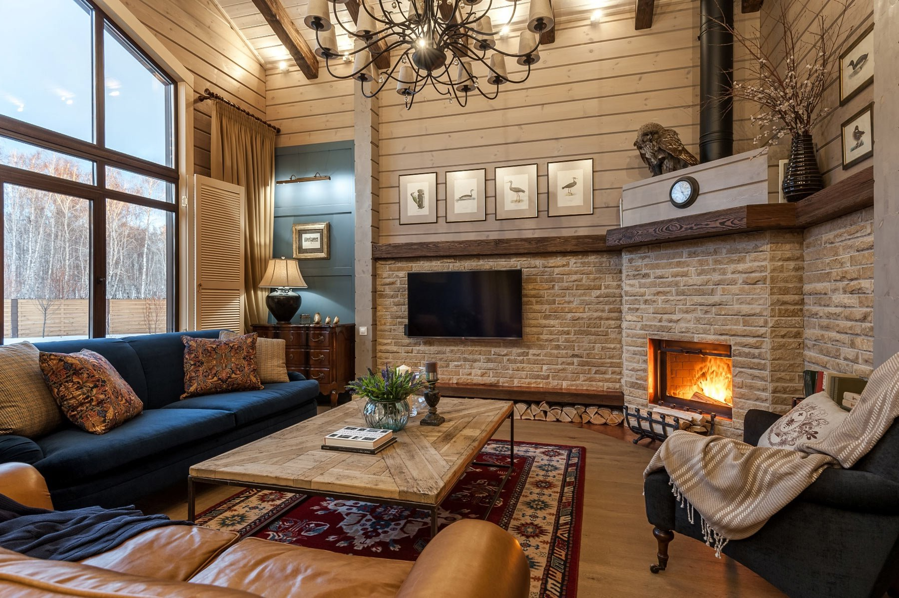 Современный дизайн интерьера уютной дачи с камином и деревянной мебелью